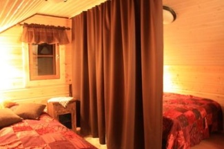 Yläkerrassa on kaksi makuusoppea, joissa kummassakin majoittuu kaksi henkeä. Yläkerrassa myös vaatteille sopivat piirongit.