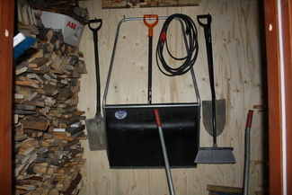 Liiteristä löytyy puita pilkottuna. Lumikola ja-lapio säilytetään myös täällä.